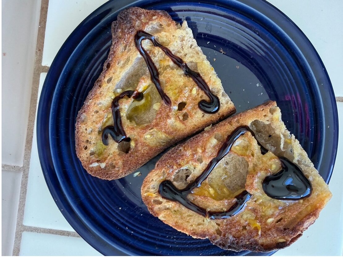 Toast the bread until it is a bit crunchy on the outside. Take a clove of garlic and rub it over the toast. Cut the tomato in half and do the same. Drizzle with olive oil and balsamic glaze. Eat!
