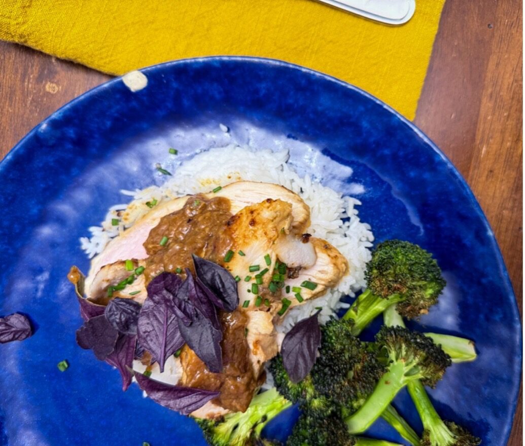 In a bowl, add the miso and ponzu sauce. Stir until smooth. (If you can’t find ponzu sauce, substitute with 2 tbsp soy sauce and a squeeze of lemon). Marinate Chicken. Cook chicken. I used an air fryer set to 380 degrees for 13 minutes. In a traditional oven cook at 425 for 15-20 minutes or until the chicken reaches an internal temperature of 165 degrees. The additional marinade left in the bowl can be placed in a small pot and simmered and used for a finishing sauce. Make sure you simmer it to kill the salmonella from the chicken. Let rest for 5 minutes and serve with rice and a veggie. Garnish with the sauce and basil.