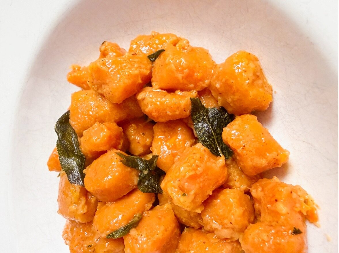 Microwave or roast sweet potato until it is soft and can be poked through with a fork. Discard the skin. In a bowl mix the sweet potato meat with the flour and salt until everything is mixed consistently. Knead gently. Cut pieces off the dough and roll into long snakes. Cut into about ½ to ¾ inch nuggets. Boil for 3-4 minutes depending on thickness. Serve with a browned butter and sage, or other sauce of your liking. Enjoy!
