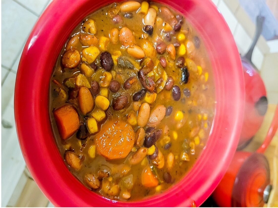 In a stock pot or large pasta pot over medium heat add the oil and toast the chili powder with the bay leaves for one minute. Add in the onion, shallot, jalapeño, and bell peppers (red and green) and stir until softened about 2 minutes. Add the mushrooms, carrots, corn, beans (kidney, black, and pinto) and garlic, stir, and cook for 1 minute. Add the lime juice and vegetable broth and bring to a simmer. Simmer for at least an hour. Longer is better. EAT!